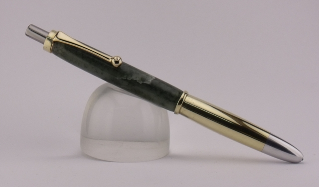 A great custom bullet casing pen made for me by Don T from USA. I think the green material is soapstone |